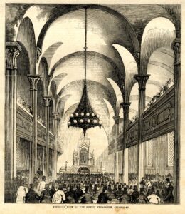 During this time period, newspapers rarely included illustrations in their pages, let alone pictures relating to the Jewish community. One exception was the Illustrated News which printed an image of the interior of a synagogue (Congregation Rodeph Sholom) on Clinton Street on the Lower East Side, on May 14, 1853. A curious observation in the accompanying article, “The New Synagogue” states: “The principal portion of their [the Hebrews] service is chanted – one of the essential qualifications of a leader being a thorough knowledge of music, which art is probably more cultivated among the Jews than among any other race in the world.”